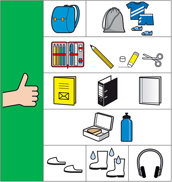 bitte entnehmen Sie dieser Liste (pdf, 55.9 KB), welche Schulsachen und Arbeitsmaterialien Ihr Kind in der Schule braucht.