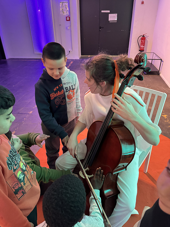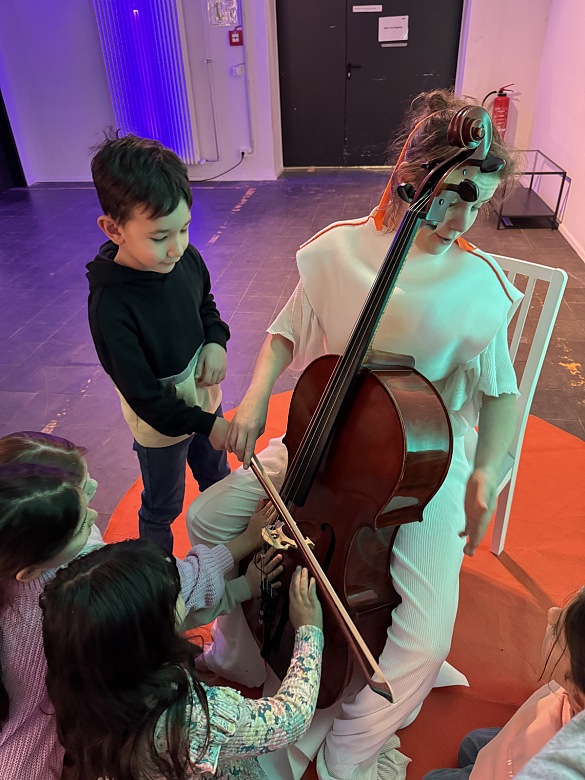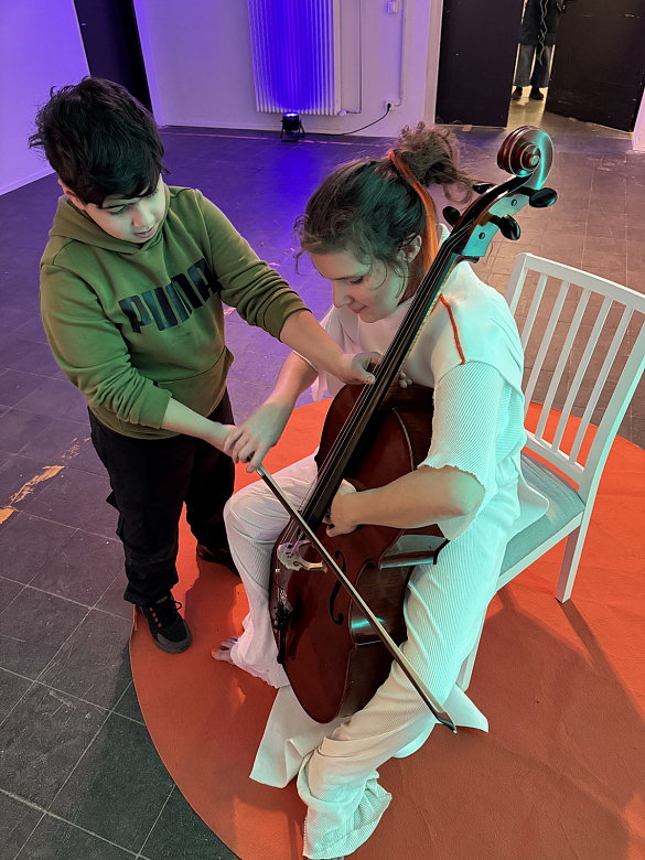 Schüler:innen dürfen auf einem Cello spielen und die Schwingungen der Töne spüren