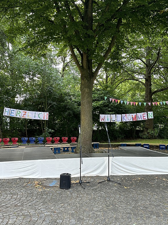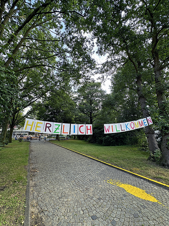 Herzlich Willkommen-Banner am Eingangstor des Schulgeländes