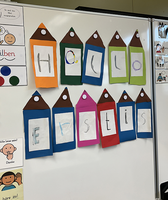 Alle Kinder wurden zuerst mit einem Bühnenprogramm begrüßt, bei dem die Zweit- und Drittklässler:innen unser Schullied "An der Walliser Straße" und das Einschulungslied "Heut ist dein erster Tag an der Grundschule Walliser Straße" sangen. Bei dem Einschulungslied stellte sich auch das gesamte Mitarbeiter:innenteam mit einer individuellen Strophe vor.