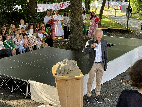 Während Walli der Drache interviewt wird, warten die Zweit- und Drittklässler:innen gespannt auf ihre Patenkinder