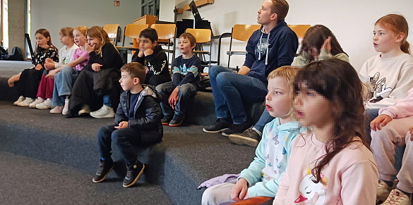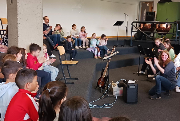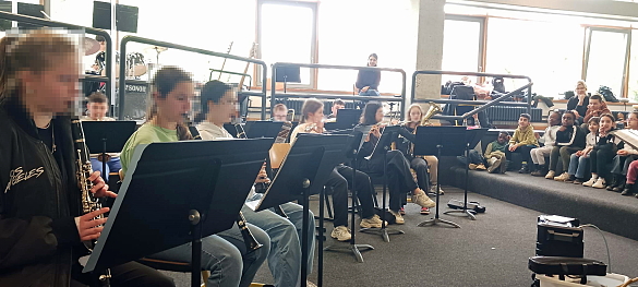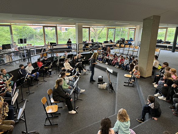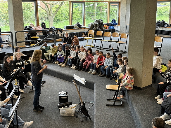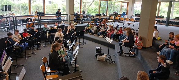Zusammen mit der Bläserklasse 6.1 der 6. Jahrgangsstufe der GSO haben wir am 19. April 24 unsere Lieder gesungen und wir wurden mit den Instrumenten begleitet. "I like the flowers", "Hejo, spann den Wagen an" und "Bruder Jakob" klangen sehr gut zusammen. Das von Imke Howie geleitete Blasorchester spielte uns noch Stücke aus ihrem Programm vor. Jetzt üben wir für einen ersten gemeinsamen Auftritt am 07. Juni 24.