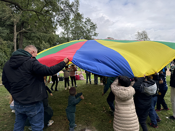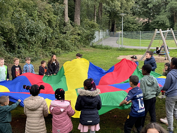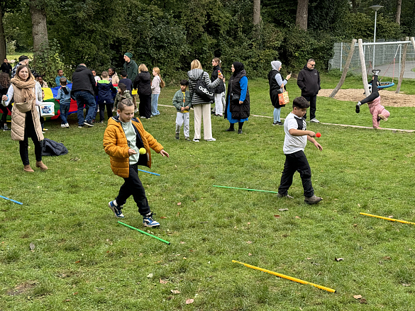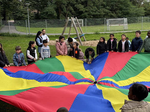 Auf dem Schulhof gab es weitere Angebote, wie einen Eierlauf und ein Schwungtuch. Einige Familien machten auf dem Schulhof ein Picknick.