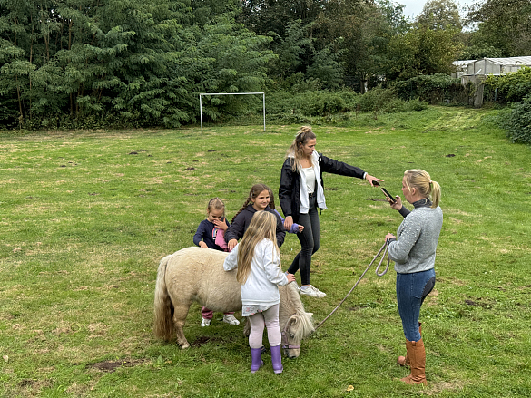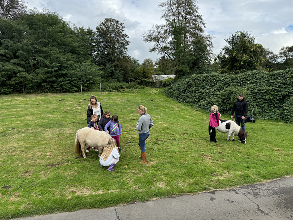 Ein Highlight waren die Ponys, die von den Erwachsenen des Pferdeprojekts auf einer Wiese neben dem Schulhof betreut wurden. Immer drei Kinder konnten sich den Tieren behutsam nähern. Für viele Kinder war es das erste Mal, ein Pony zu sehen sowie streicheln und füttern zu können.