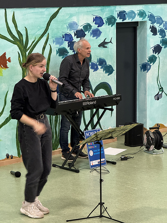 Herr Leimbach und Frau Heilmann begleiten das Singen