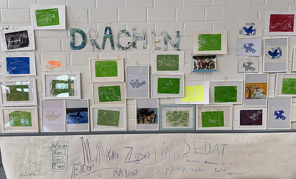 Der Drache Walli als Monotypie und als Moosgummidruck