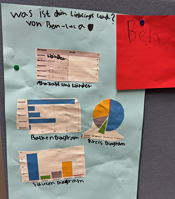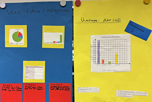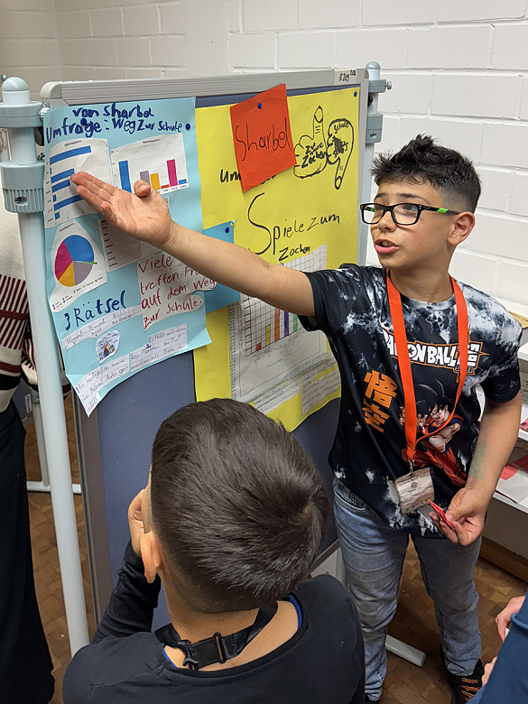 Kinder präsentieren Diagramme zu Umfragen vom Mathe-Forderlabor