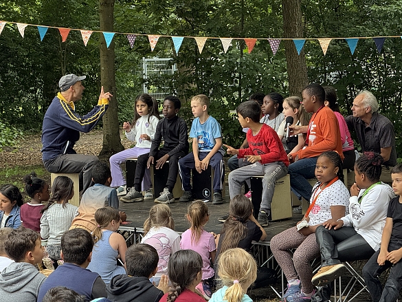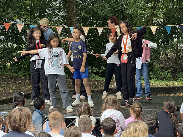Da das Wetter mitspielte, konnten wir draußen auf unserem "Platz unter der Linde", wo auch jedes Jahr unsere Einschulungsfeier stattfindet, eine Bühne aufbauen. Zu Beginn des Lernfestes konnten die Schüler:innen und Eltern dort unter anderem den Aufführungen der Projekte "Singen für den Frieden", "Tanzen und Bewegungsspiele basteln" und "Percussion" folgen.