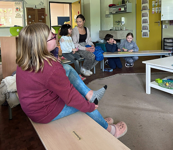 Im Schuljahr 2023-2024 gab es das Projekt "Sprach- und Singspiele". Dort haben die Kinder Lieder gesungen, Reime gebildet und dazu Tanz- und Bewegungsabläufe einstudiert sowie zum Rhythmus geklatscht. Auch Gesellschaftsspiele zum Thema "Reime bilden" und zur Wortschatzerweiterung gehörten dazu.
