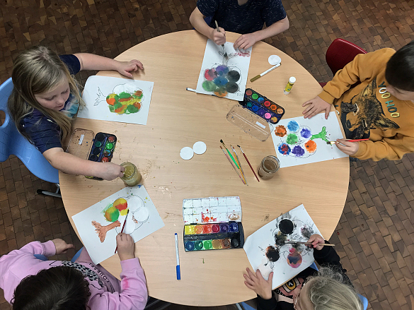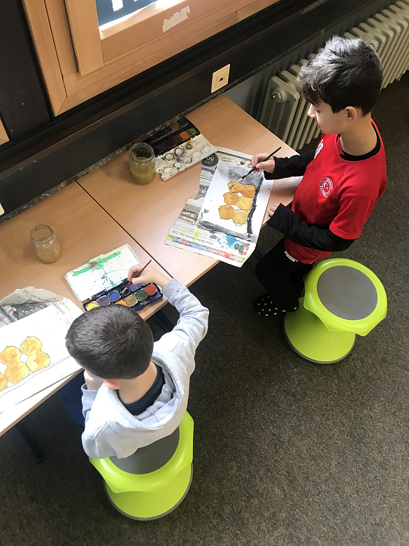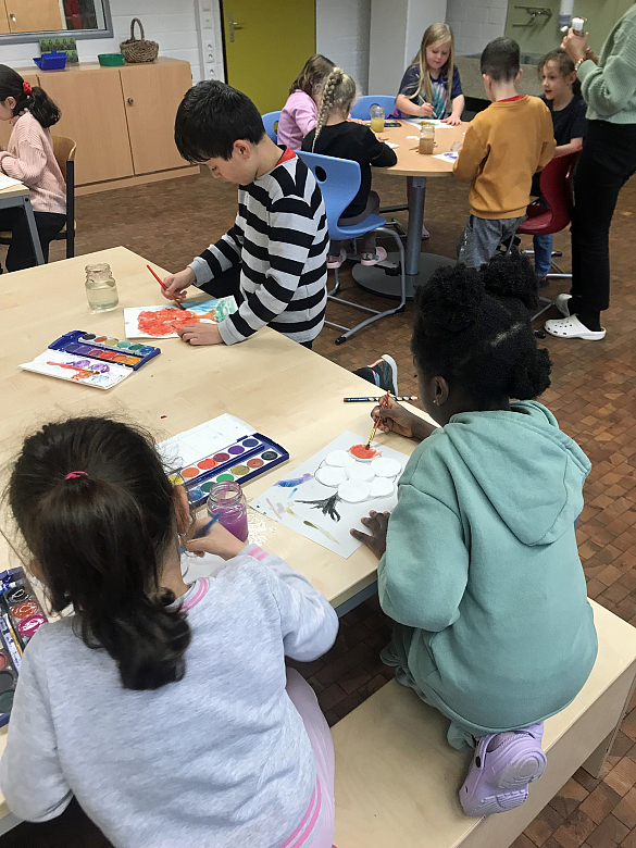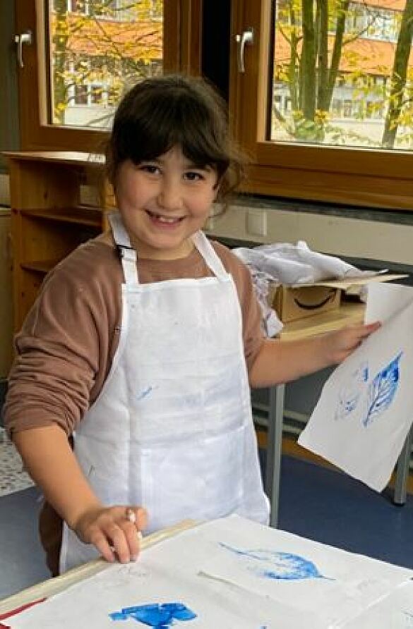 Im Schuljahr 2024-2025 gab es das Projekt "Druckwerkstatt". Dort haben die Kinder verschiedene Drucktechniken kennengelernt: Kartoffeldruck, Materialdruck mit Alltagsgegenständen und Blättern, Finger- und Handabdruck, Schablonendruck, Monotypie, Stempeldruck, Milchtütendruck.