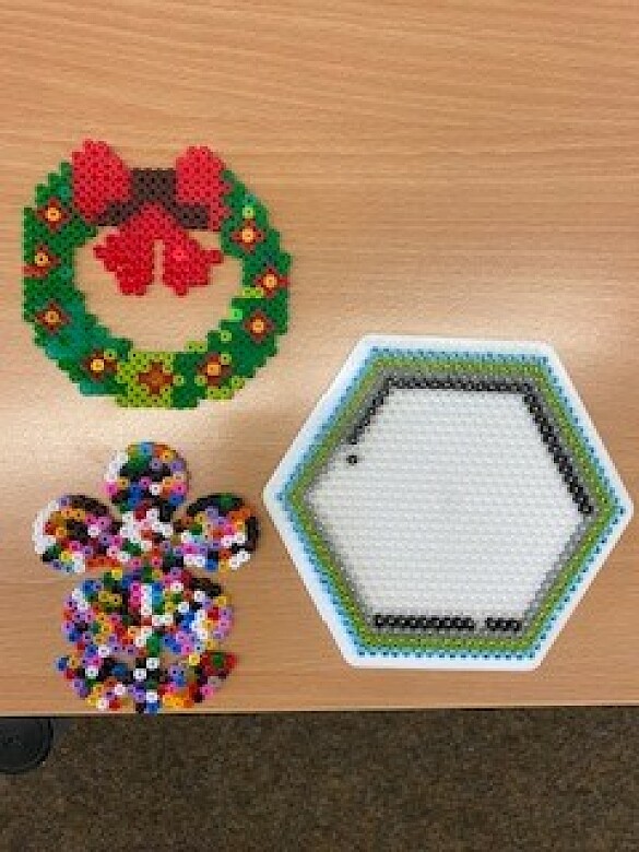 Im Schuljahr 2023-2024 gab es das Projekt "Basteln mit Stoff und Perlen". Dort haben wir verschiedenste Bügelperlmotive gelegt, Bilder ausgeprickelt und diese mithilfe von Nadel und Faden verschönert.