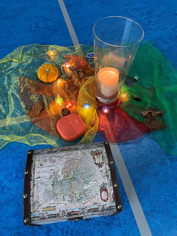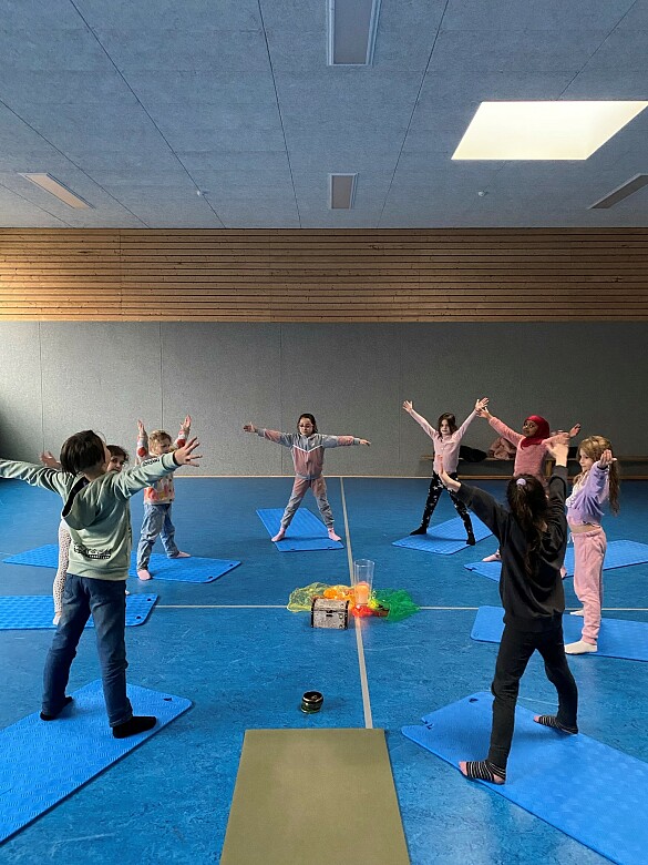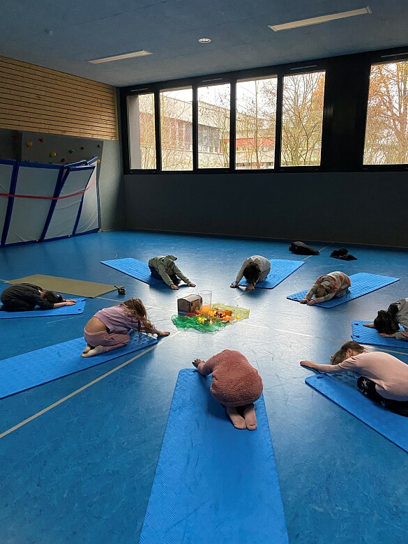Im Schuljahr 2023-2024 gab es das Projekt Kinder-Yoga. Dort haben wir verschiedene Rituale kennengelernt, die wir regelmäßig wiederholt haben. Wir haben verschiedene Körperübungen ("Asanas") kennengelernt und ausprobiert und diese in Bewegungsgeschichten und kleinen Yoga-Spielen geübt und gefestigt. Außerdem haben wir Atemübungen sowie Massagen und kleine Traumreisen zur Entspannung gemacht. Unsere Matten haben wir immer um eine dekorierte Mitte (passend zur Jahreszeit gestaltet) aufgebaut. Kurz gefasst ist es ein Mix aus Bewegung und Ruhe.