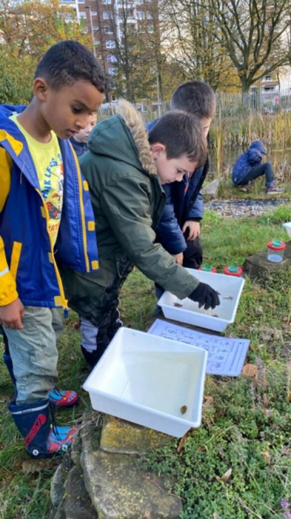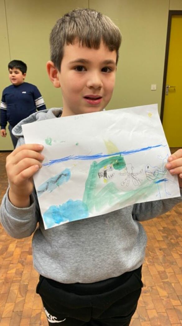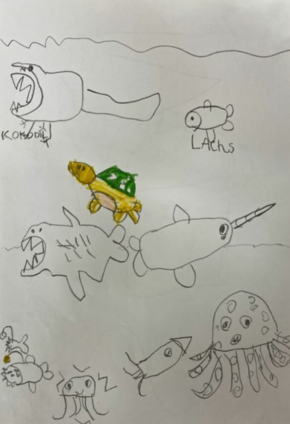 In diesem Projekt werden unterschiedliche Schwerpunkte angeboten. Beim Thema "Leben im Wasser" haben die Kinder zu verschiedenen Fragen geforscht. Wir haben Ausflüge zum Teich von "Queerbeet" gemacht, wo die Schülerinnen und Schüler keschern konnten. Sie haben kleine Wasserlebewesen gefunden und wir haben gemeinsam erforscht, wie sie heißen. Sie haben Lebewesen im Wasser gemalt und ihre gezeichneten Fische auf Tonpapier ausgeschnitten.