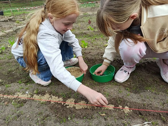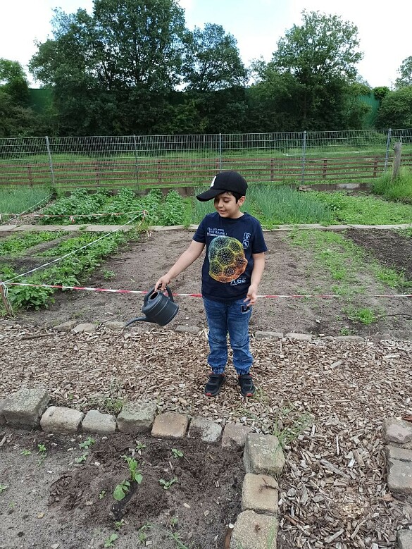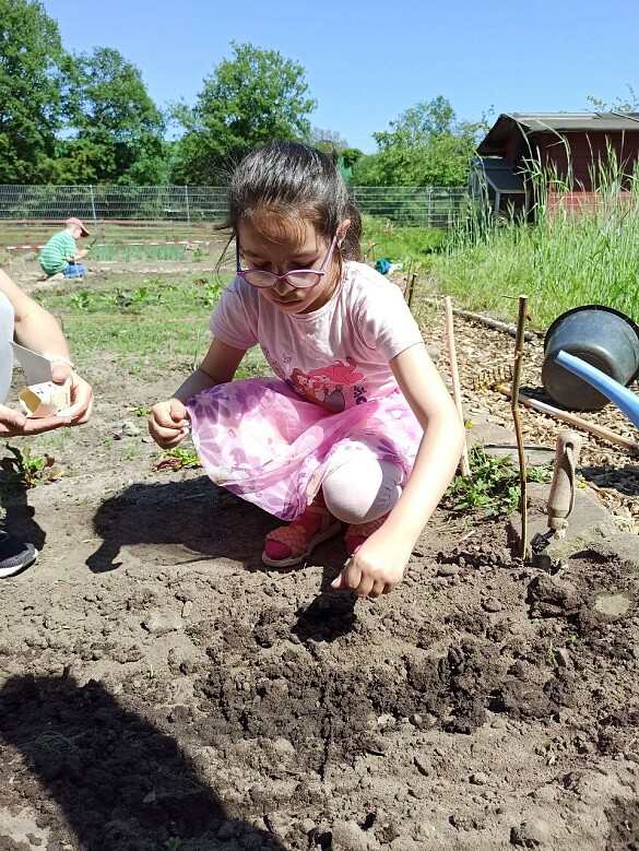 Im Projekt Gemüse-"Ackerdemie" bepflanzen und versorgen wir unsere eigene Ackerfläche. Wir haben die Wildkräuter entfernt, damit wir Platz haben unser Gemüse zu pflanzen. Wir haben Jungpflanzen und Kartoffeln gepflanzt und Samen eingesät. Außerdem haben wir gelernt wie man richtig mit einem Grubber, einem Spaten und einer Schaufel arbeitet. Wir pflegen unsere Beete, indem wir die Pflanzen regelmäßig kontrollieren, wässern und Wildkräuter entfernen. Dabei entdecken wir immer viele verschiedene Tiere im Boden.